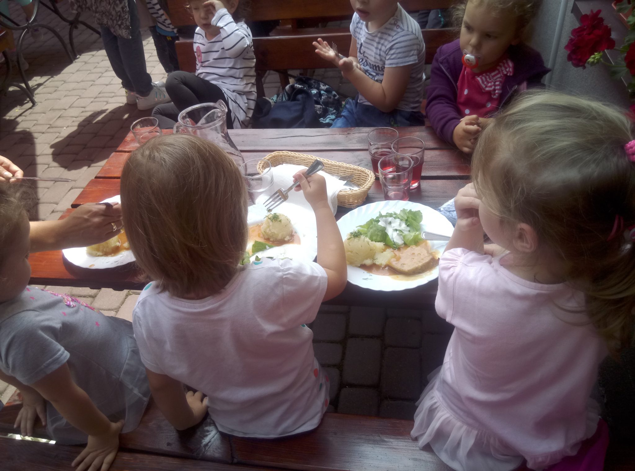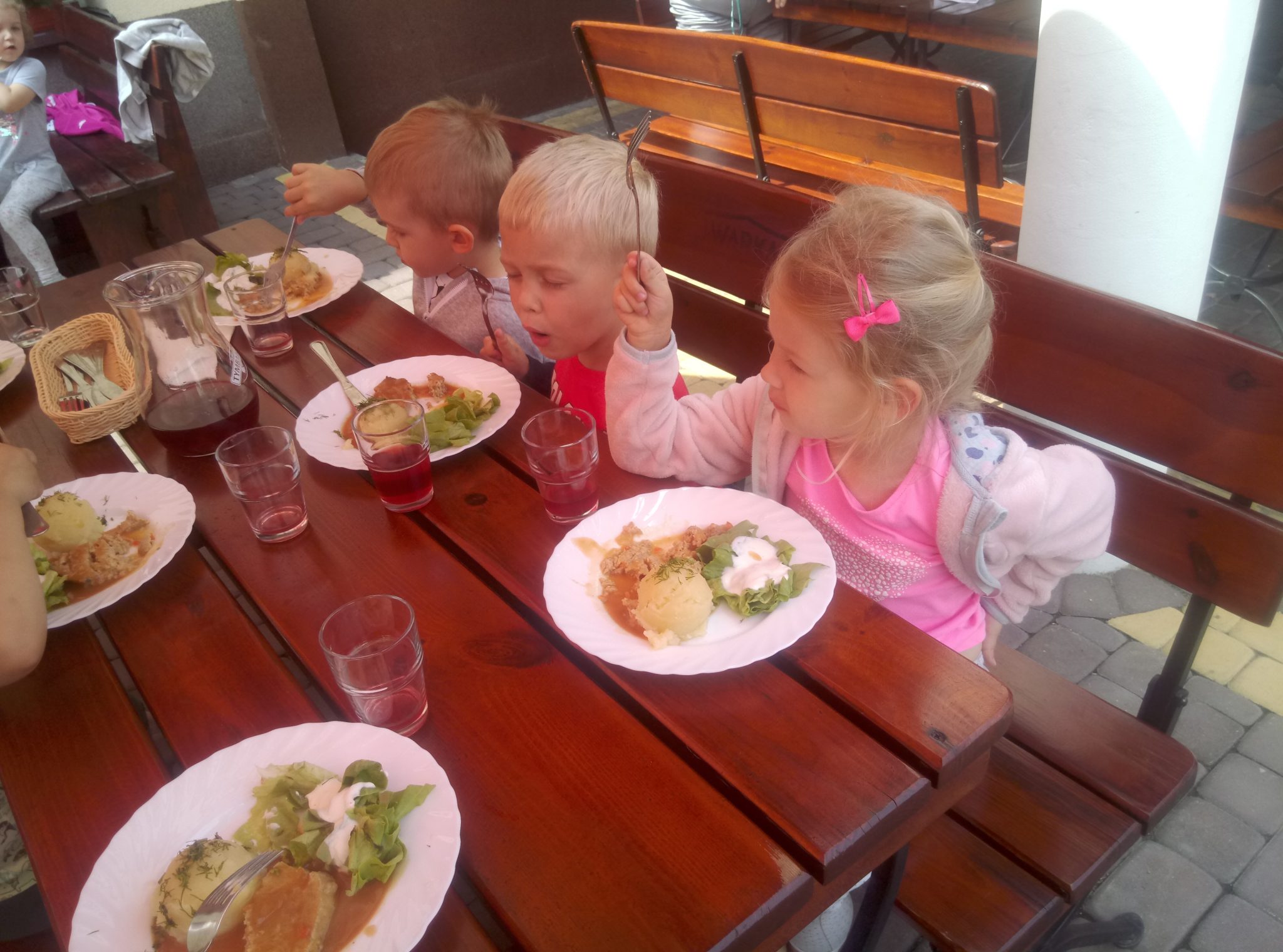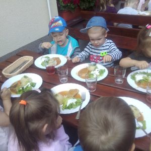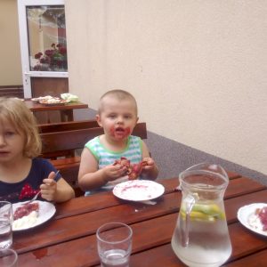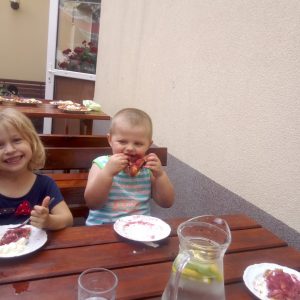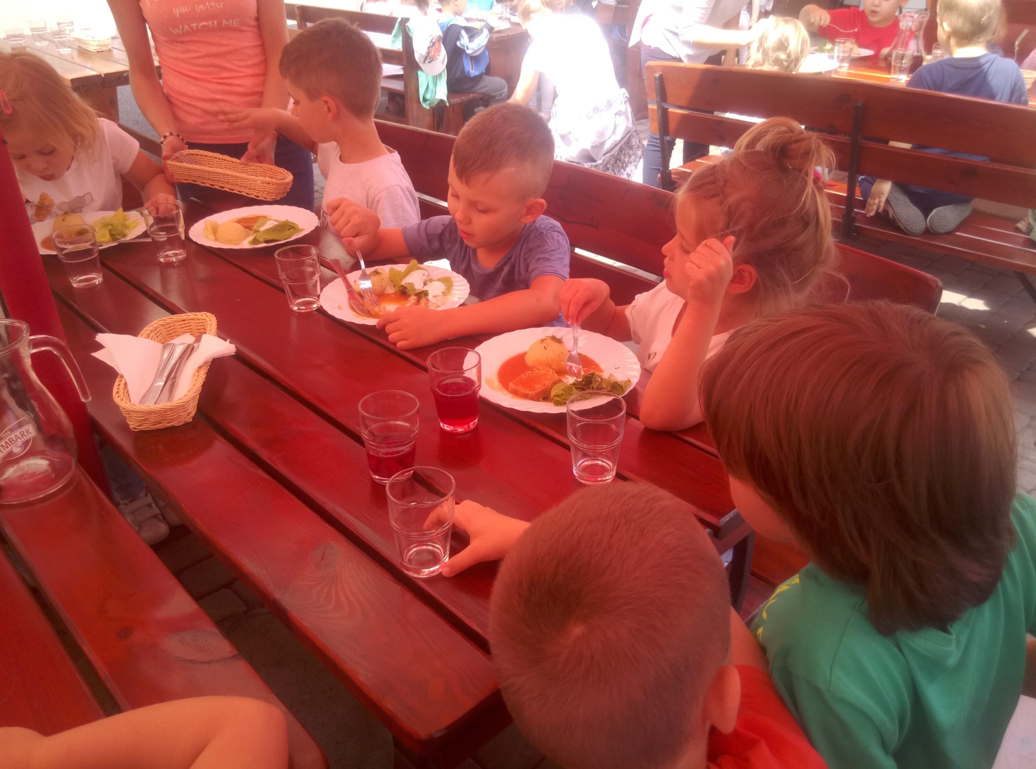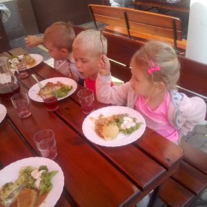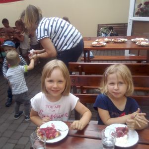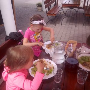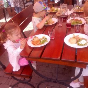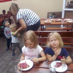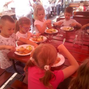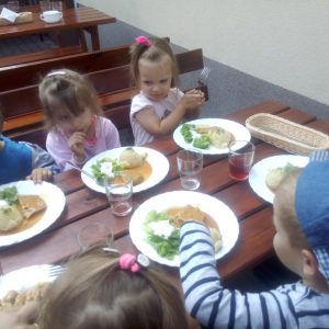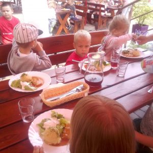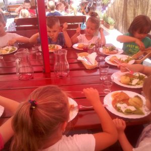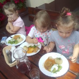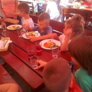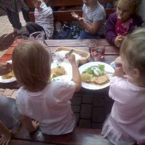 Głodni, zmęczeni, ale szczęśliwi dotarliśmy do docelowego miejsca naszej podróży – Restauracji Zamkowej w Drohiczynie. Czekała tu na nas, jak zawsze uśmiechnięta i serdeczna Pani Teresa z przepysznym obiadem i deserami.